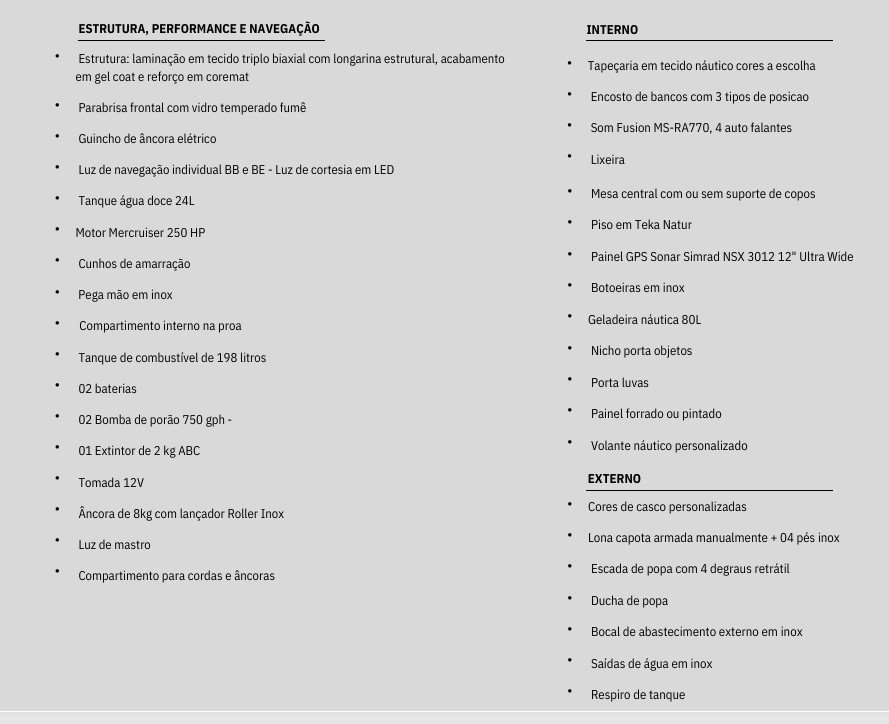 fazendo comparações, especialmente com carros esportivos italianos clássicos. Este modelo oferece a sensação do melhor barco de corrida. Ele simboliza o casamento perfeito entre esporte e conforto, proporcionando estabilidade e equilíbrio excepcionais a bordo para garantir um alto nível de conforto tanto para os passageiros quanto para o capitão.